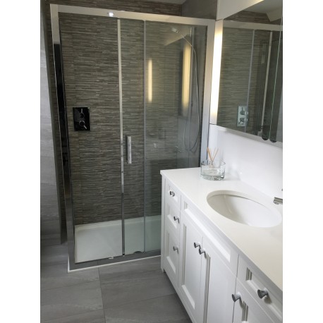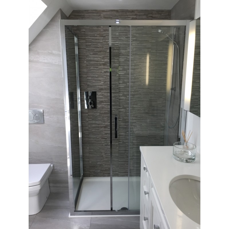 1.Tiles-Soft Stone Grey Porcelain Wall an Floor tiling size 60x30cm £49per m2,Strata Grey Feature Shower back wall size 16.5x41cm £54per m2 2.WC-Compact Back-to-Wall WC including soft close seat £245,Concealed Cistern including Chrome Flush £145 3.Shower Enclosure & Shower Fittings-Premier Sliding Door Enclosure 120cm £1195,Low Level White Shower tray 120x80cm £195,Thermostatic one way shower valve £295,Flexible Shower kit with built in outlet £115 4.Vanity & Mirrored Cabinet-Henbury White Multi Drawer Vanity,Quartz White Top with under mounted Oval ceramic Basin £1950,Basin Mixer £139,Two Door Illuminated Bathroom Cabinet inc Shaver socket £1150 5.Heated Towel Rail-Chrome Finish 150x50cm Flat Tube heated Towel warmer including radiator valves £225